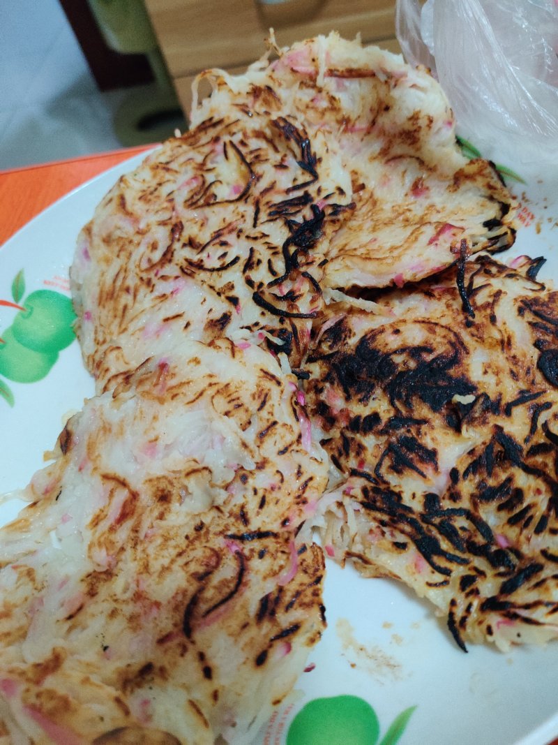 1:旱萝卜擦丝备用,一盒大盆儿里放一碗面粉,两个打散的鸡蛋,适量盐和胡椒面,把擦好的旱萝卜丝分次放入拌匀
