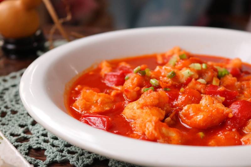 6:锅洗净,重新倒上油,放入西红柿炒一下,再加上番茄酱,糖,盐调味,最后把龙利鱼倒入锅里一起翻炒均匀即可出锅