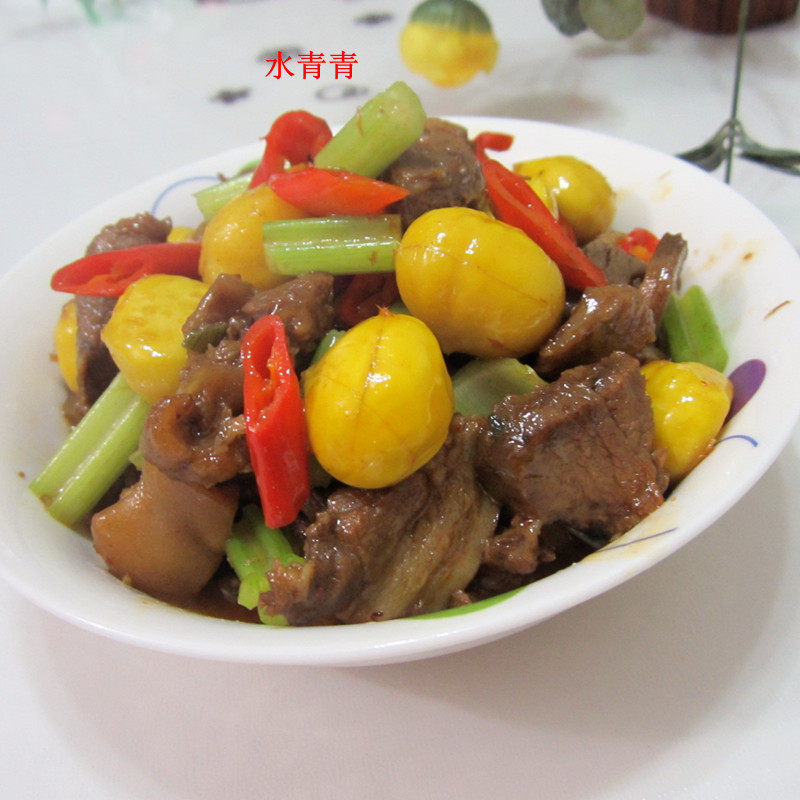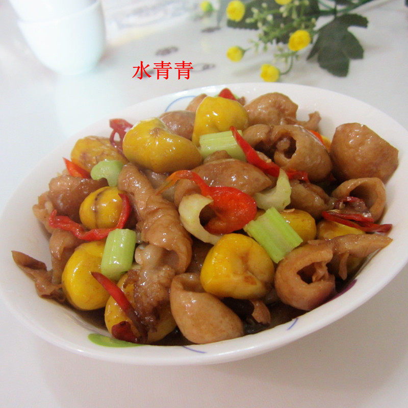 1:板粟去壳,生肠切丝或切块,切点蒜片,生姜,辣椒丝。