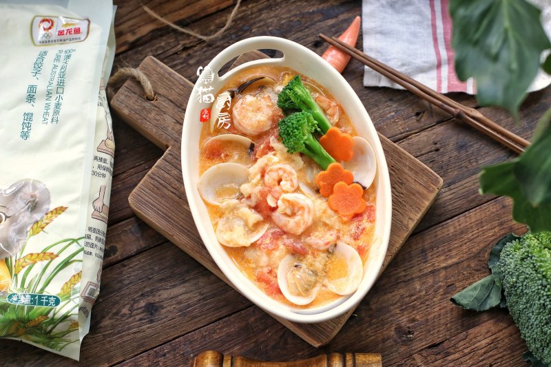 澳麦粉200克;鸡蛋1个;鲜虾8只;白贝半斤;西红柿1个;