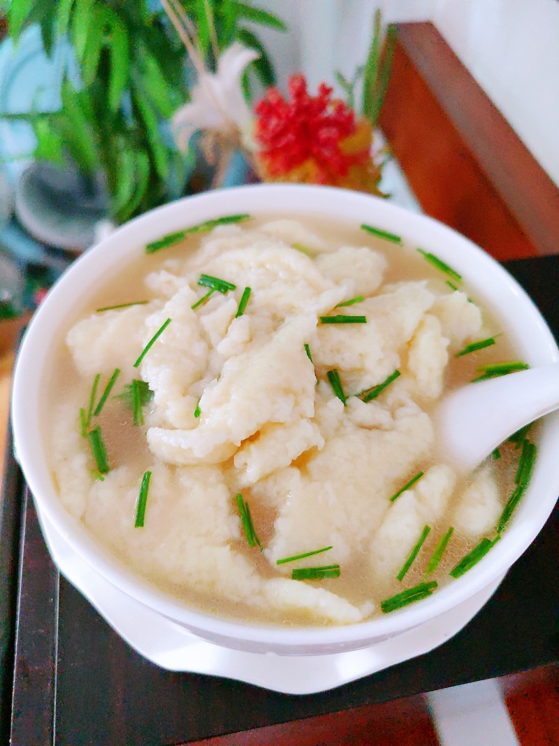 5:锅开后搅入面絮,打入鸡蛋,待再开后放入青菜,加入盐,胡椒,锅开即可食用