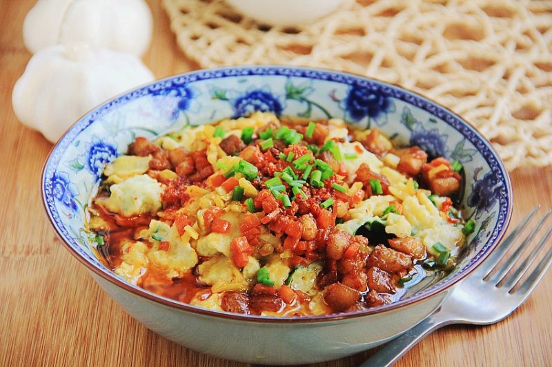 6:炒好的肉放在疙瘩面上,将榨菜切成小粒放疙瘩面上