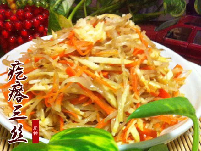 7:煸炒片刻放笋丝,红罗卜丝少许味精,盐,香油炒匀即可。