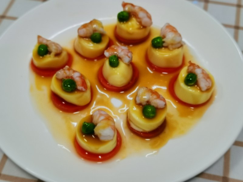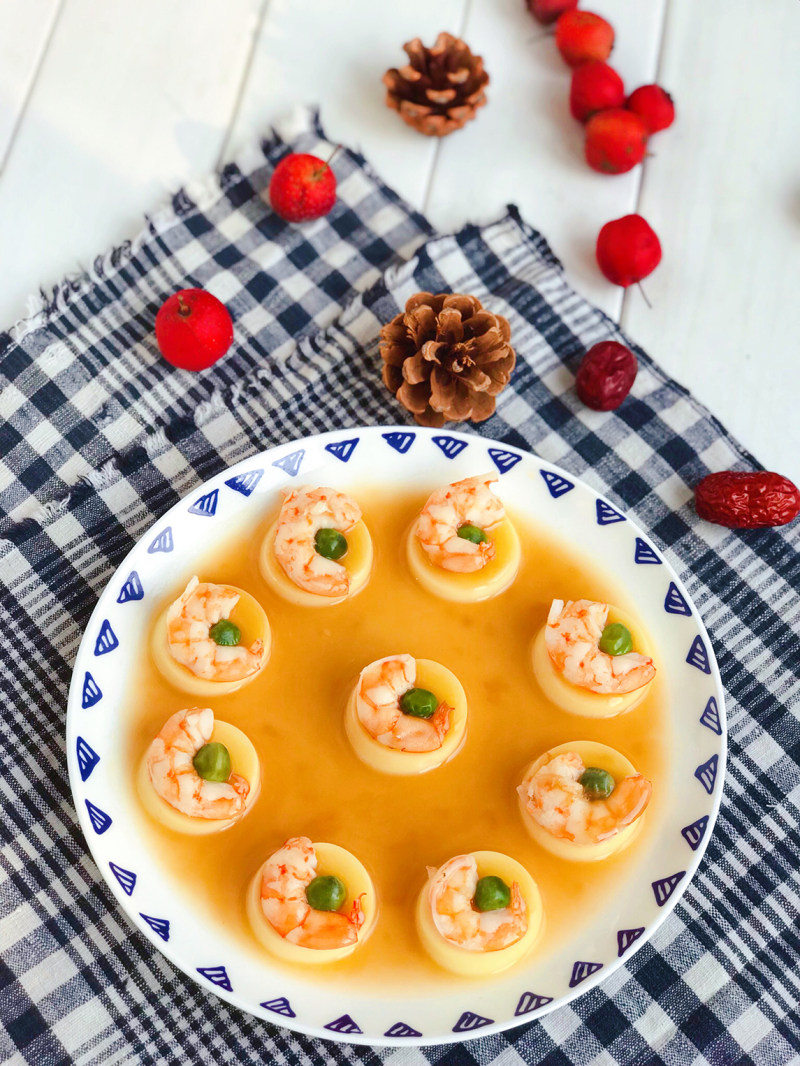玉子豆腐3个;虾10个;青豆少许;