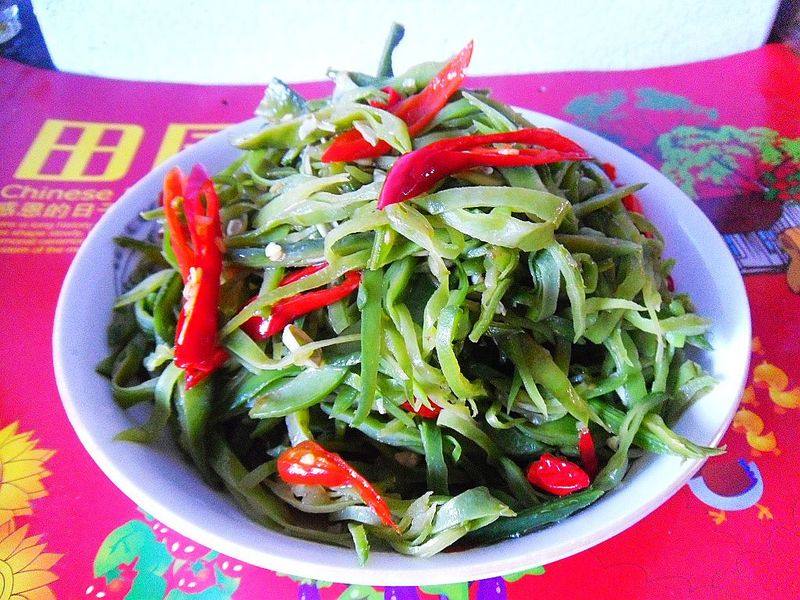 2:把扁豆摘筋、洗净、切丝。