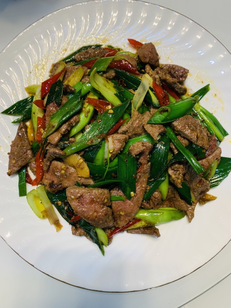 15:加入猪肝,葱段迅速翻炒均匀即可。