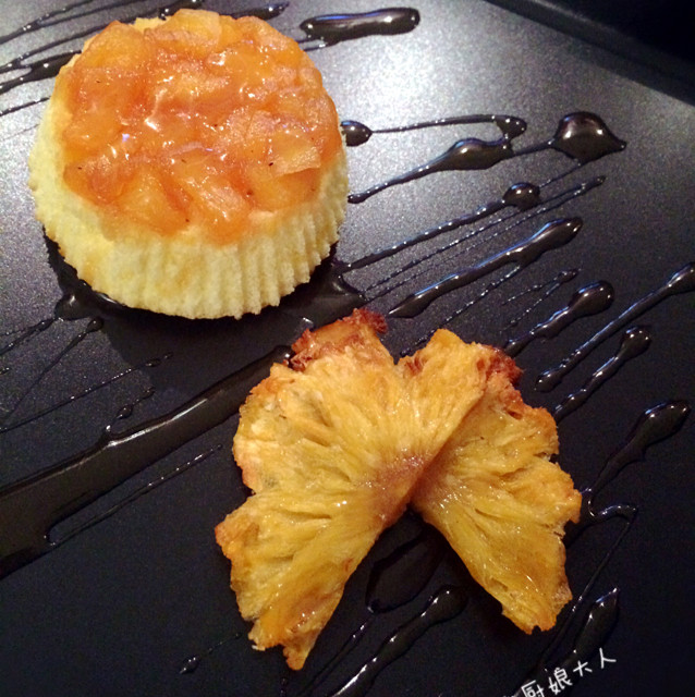 19:吃的时候去掉纸膜,翻转起来,配上烤菠萝干,用前面滤出的糖汁装饰盘点。香甜美味的小茶点就上桌啦!
