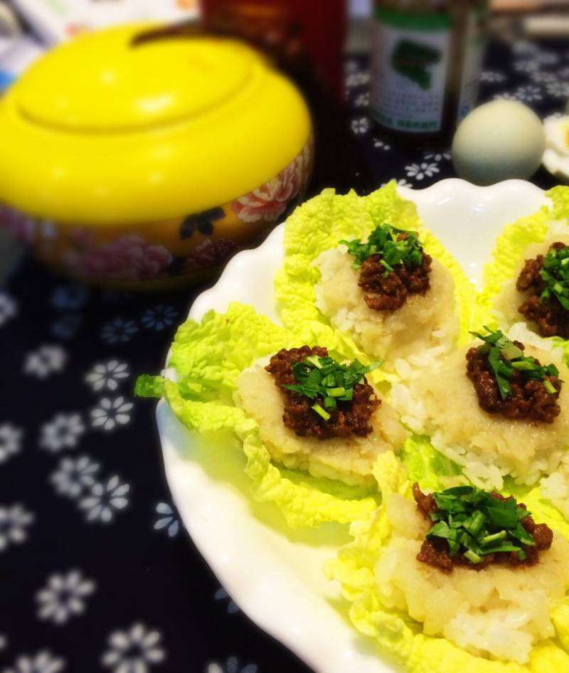 7:在菜叶上铺一层米饭,再铺一层土豆泥。