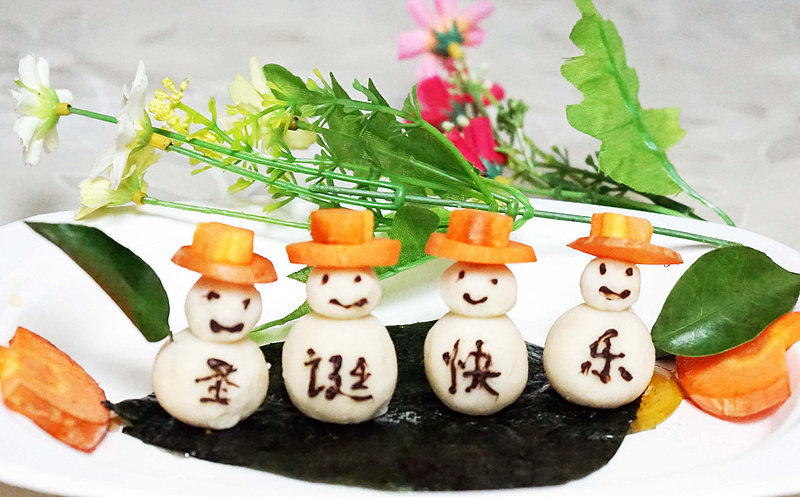 10:萝卜尖用来做雪人帽子。韭菜涨水里灼烫,做雪人围巾。