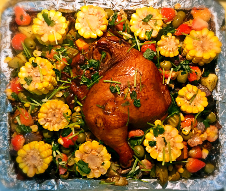 8:烤鸡的空档里把玉米切片,热锅烧水加入白糖,水开后放入玉米改小火煮20-30分钟。顺便把草莓和橄榄也可以用糖水焯一下。烤鸡出炉后摆入烤盘,均匀撒一层香菜就可以啦。