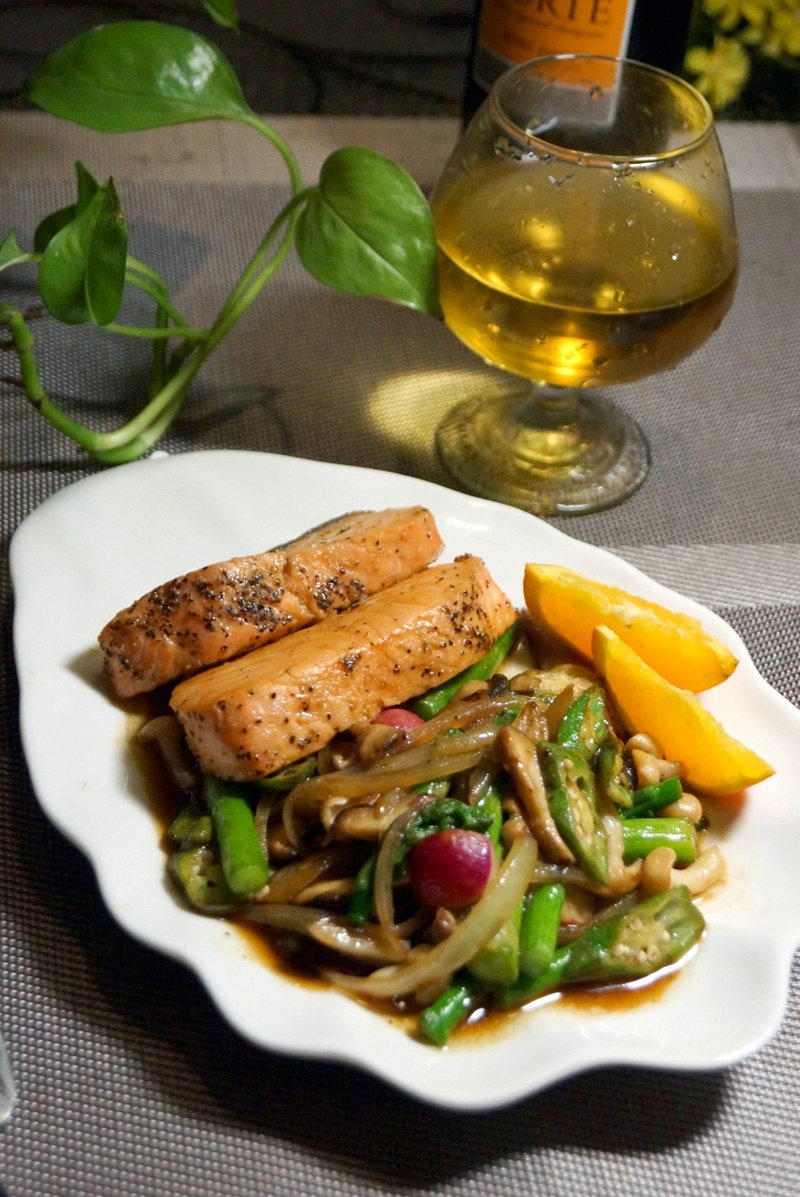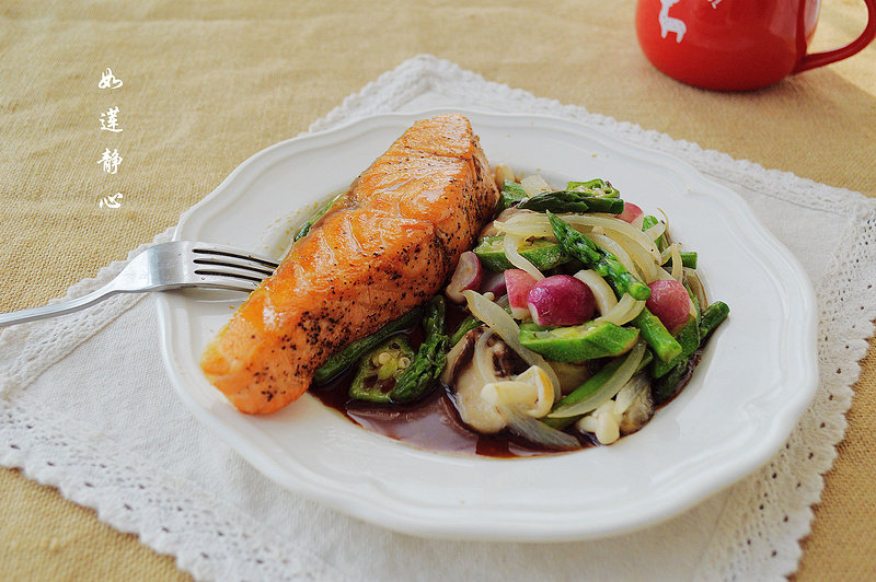 6:、将蔬菜放入盘中,摆上三文鱼,浇上汁即可,美味即可开始了。呵呵