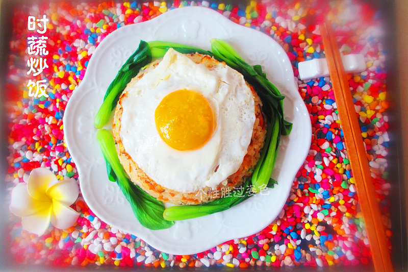 9:炒好的米饭用碗扣压出形状,放上煎好的荷包蛋和青菜,就可以开吃了