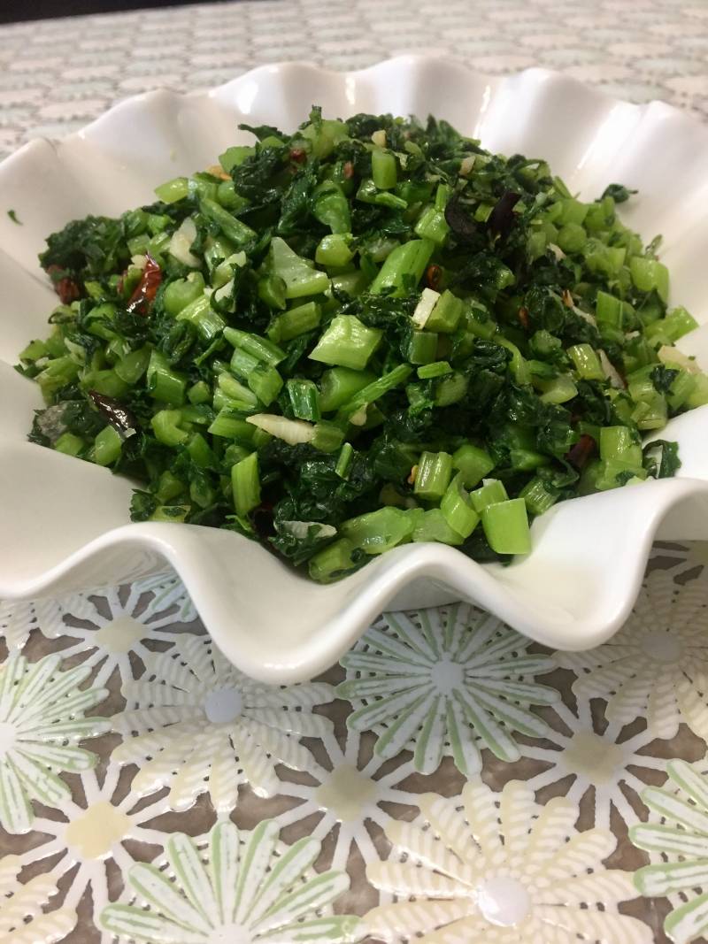 2:炒锅烧开水,放入雪里红烫一下,又叫过水,是为了过掉一些青涩味。两分钟就赶紧捞出来。