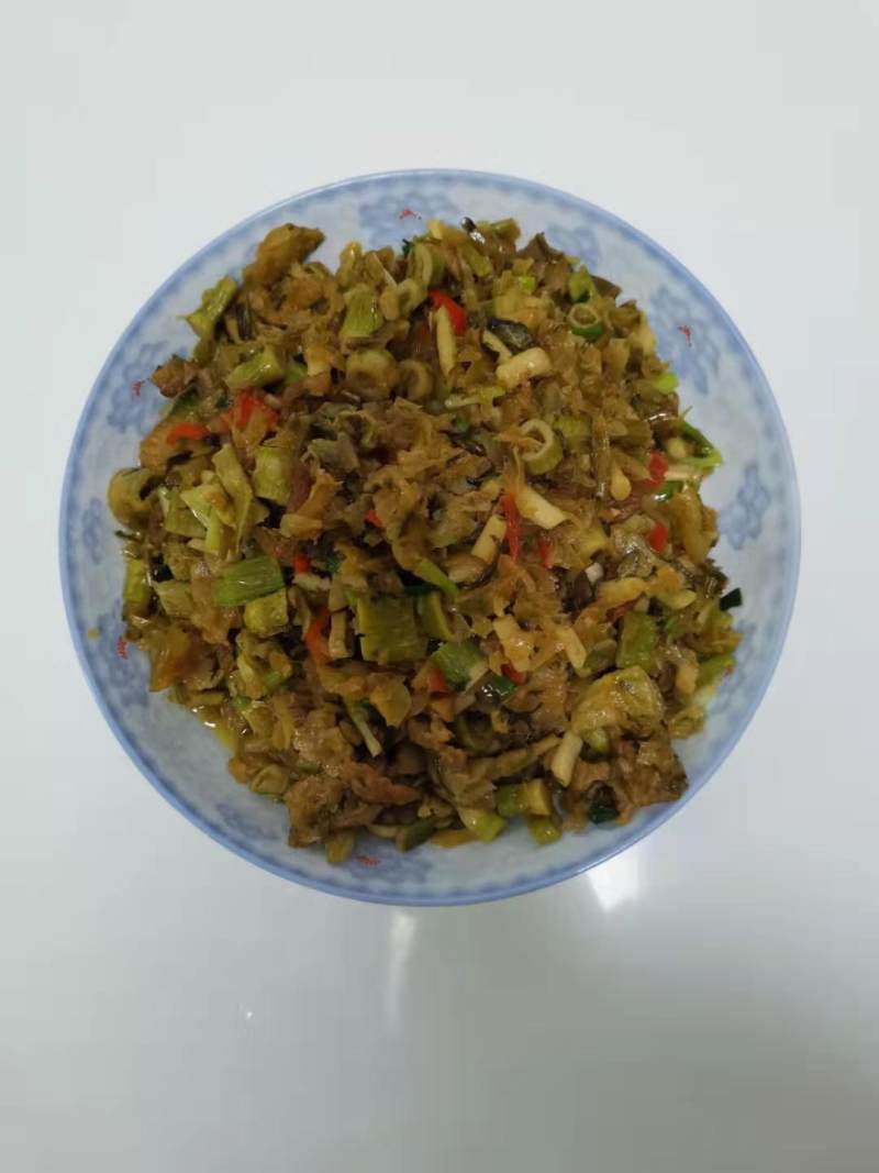 3:放入切碎挤出水份的雪里红大火翻炒后,加入少许味精拌匀盛出即可