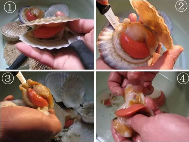 【吃的技巧】开口小的扇贝,可以用小刀在贝壳边缘撬一下,然后用小刀沿扇贝丁底部割一下,就可以将整个扇贝肉取出来啦,超简单的。