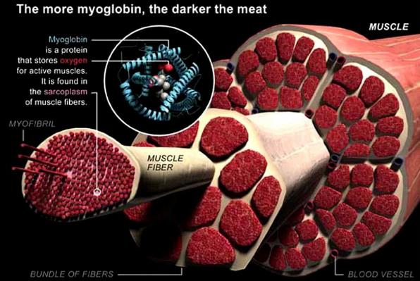 通常说来,牛、羊、猪等四足动物的肉,因为肌肉中肌红蛋白的平均含量较高而呈现深红或粉红色,同样的,鲣鱼、金枪鱼等鱼类的肉,也因为白肌细胞富含肌红蛋白而显现出暗红色,人们一般将这类肉统称为“红肉”。而以鸡为代表的多数禽类的肉、绝大多数鱼类、虾蟹和贝类的肉,因为肌肉细胞中肌红蛋白的平均含量较低而呈现淡粉色或白色,因此人们统称这些肉为“白肉”。
