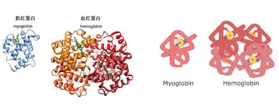 血红蛋白负责将大量氧从呼吸器官运送至身体各部,而肌红蛋白只负责为肌肉组织给氧。血红蛋白的单位载氧量是肌红蛋白的4倍,但肌红蛋白对氧的亲和力却更强,可以理解成它更容易“俘获”氧分子,因此能更高效得为肌肉的持续运动源源不断地供氧。我们可以通俗的将富含血红蛋白的血液看成万吨巨轮,而肌红蛋白则像等在码头运载集装箱的卡车,能更加精准快捷的将货物送达目的地。