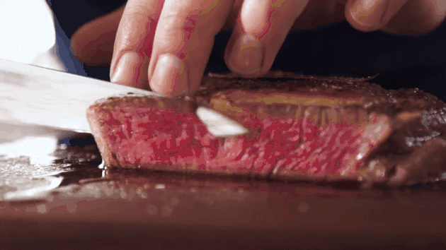 话说回来,所以我们切牛排时流出的血淋淋的“汁水”,主要是肌肉组织的水分和肌红蛋白的混合物,它并不是“血水”而是美味的“肉汁”。