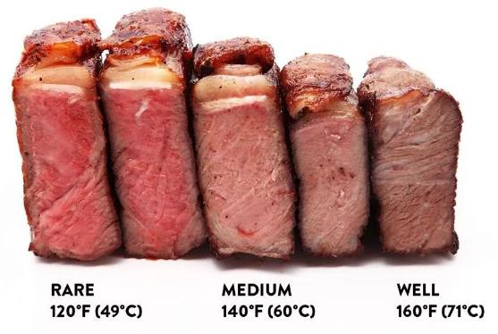 肌红蛋白加热会褐变,一块牛排渗出红色肉汁就说明内部温度还不够高。那么,半生的牛排能不能放心食用呢?人们无非是担心致病菌和寄生虫的问题。从安全角度,为了预防微生物和寄生虫导致的疾病,都建议将肉类完全烹熟。不过,只要是正规途径销售的“原切牛排”,一般可以认为只有牛排的切面上沾染有细菌,而肉的内部是处于无菌状态的,无论是三分熟或是五分熟,煎牛排时,肉表面的温度都足以杀灭细菌,因此不必担心致病菌的影响。