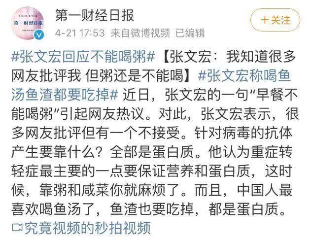 张文宏医生回应“不能喝粥”观点