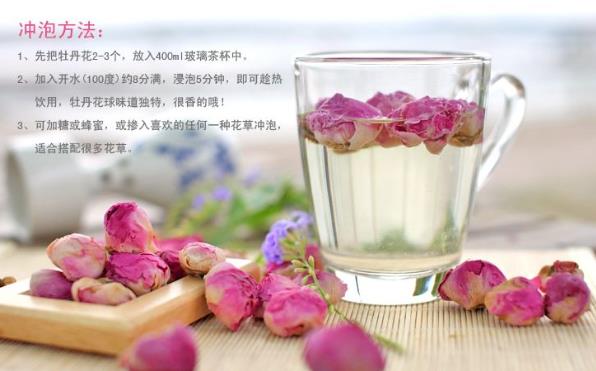 1、牡丹花茶与法兰西玫瑰、月季花一起搭配具有美容养颜、补水润肤、恢复弹性的作用。