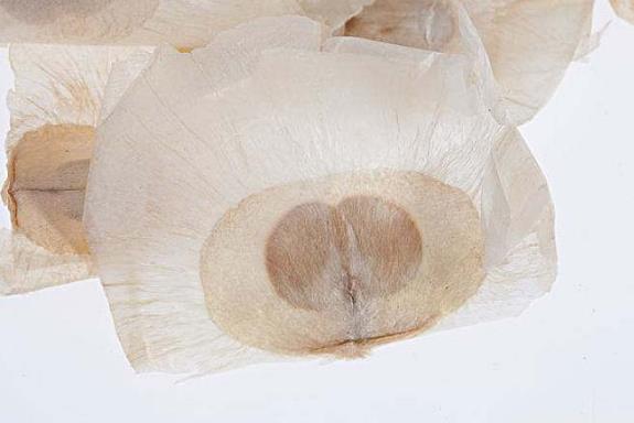 玉蝴蝶为蝶形薄片,除基部外三面延长成宽大菲薄的翅。长5~8cm,宽3.5~4.5cm。表面浅黄白色,翅半透明,有绢丝样光泽,上有放射状纹理,边缘多破裂。体轻,剥去种皮,可见一层薄膜状的胚乳紧裹于子叶之外。子叶2,蝶形,黄绿色或黄色,长径1~1.5cm。无臭,味微苦。